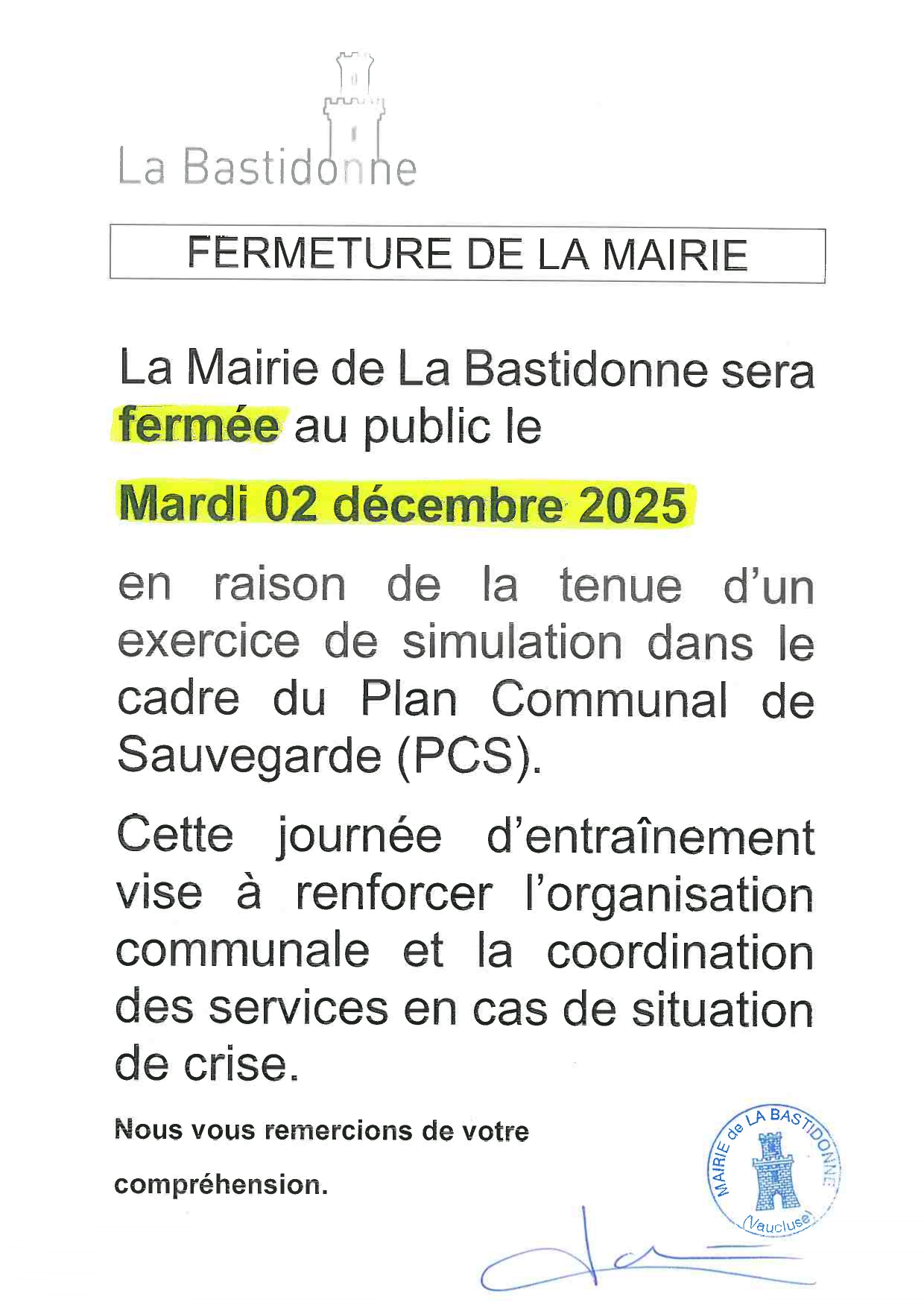 L’agence Postale Communale de la Bastidonne est ouverte les matins du Lundi au Vendredi de 8h15 à 12h15.
